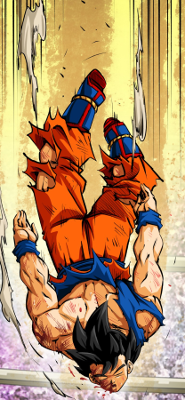 Vegeta, Gohan, Piccolo, Pan, Trunks, and Goten of Universe 18 watched in stunned silence as their friend, father, rival, and hero fell. Goku, now back in his base form, plummeted unconscious, his descent agonizingly slow.