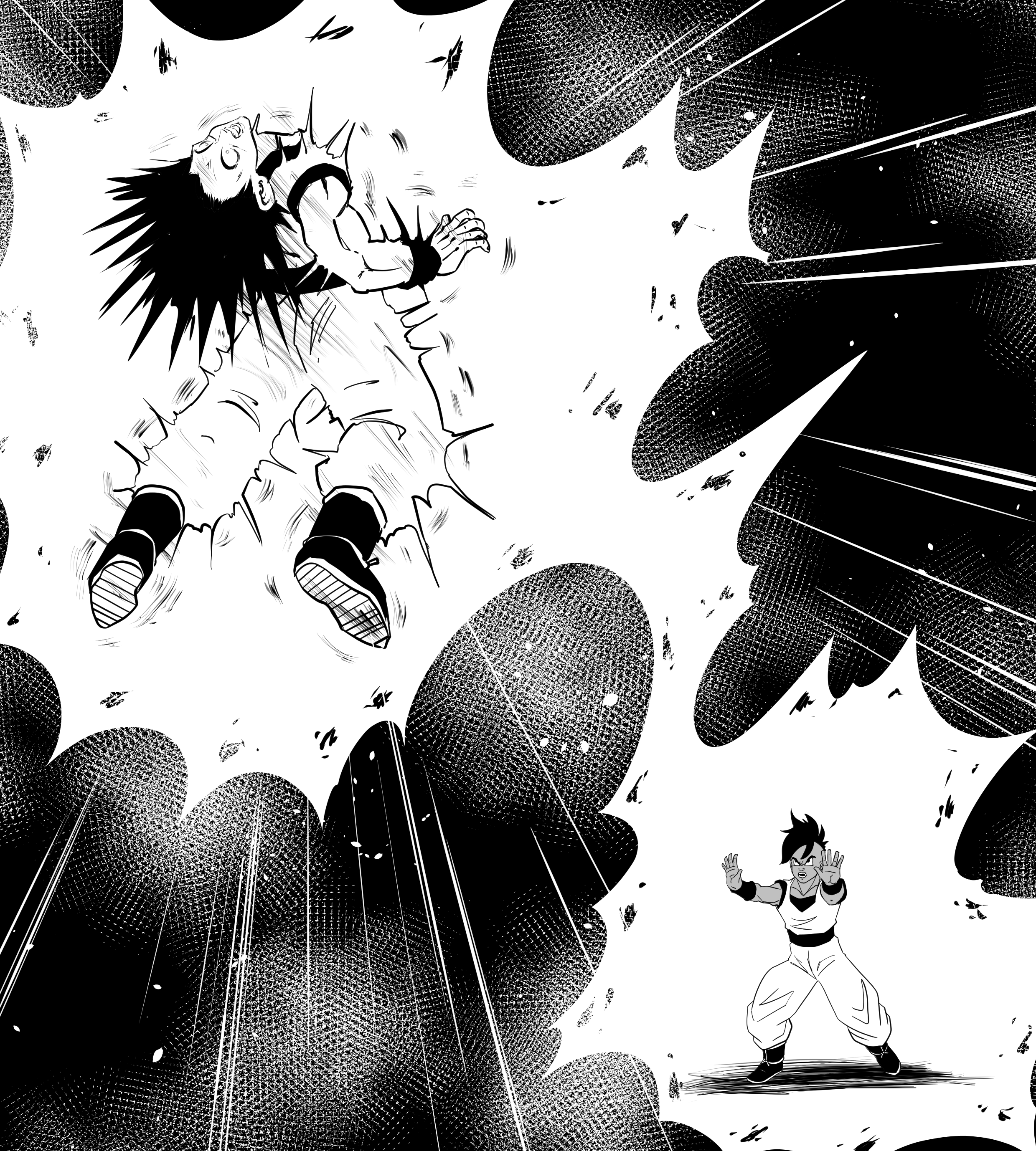 D’une pirouette habile, il s’échappa dans les airs, les Kienzans s’évaporant contre le bouclier plus loin. Mais cette seconde suffit à Son Gokû pour enfoncer son poing dans les côtes de son élève, qui poussa un cri de souffrance.
