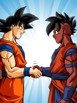 – Ne dis rien, alors, répondit le Saiyan en tendant la main. Nous sommes égaux, maintenant. Je suis fier de toi, Uub. Continue de t’améliorer, et deviens encore meilleur !