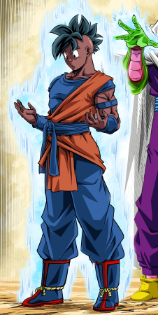Il tendit la main et reconstitua la tenue de Son Gokû. Il s’occupa ensuite de Uub, qui se tint immobile. Quelle ne fut pas sa surprise en voyant qu’il n’arborait pas la tenue habituelle de l’école de la Tortue, mais un uniforme de combat complètement original ! Elle ressemblait beaucoup à celle qu’il portait dans son village d’origine, adaptée aux arts martiaux.
